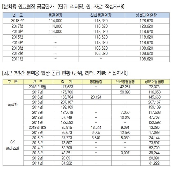 자료에 따르면 녹십자와 SK플라즈마는 혈액제제의 원료인 성분채혈혈장을 적십자로부터 표준원가 대비 77%(2017년 대비 6% 상승), 신선동결혈장은 70.3%(2017년 대비 동결), 동결혈장은 65.2%(2017년 대비 동결) 수준으로 납품받았다.