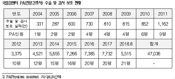 암센터가 제출한 자료에 따르면, PA 1명당 하루 평균 적게는 1건에서 많게는 4건의 수술에 참여해 온 것으로 파악됐다. 2004년에는 1명의 PA가 331건의 수술에 참여했지만, 매년 PA가 증가하면서 2017년에는 20명의 PA가 7732건, 2018년 8월 현재는 21명의 PA가 5515건의 수술에 들어갔다.