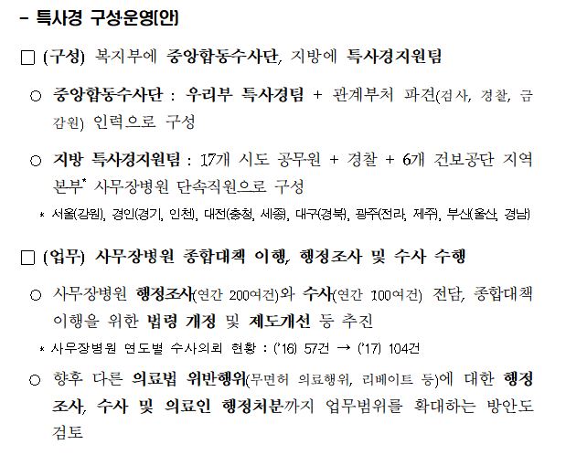 복지부는 현재와 같은 행정조사만으로는 압수와 수색, 계좌추적 등이 불가능해 사무장병원 단속에 한계가 있다며 특사경 권한 부여를 요구해왔고, 지난해 말 사법경찰직무법 개정으로 복지부 공무원에 사무장병원 수사권이 부여됐다.