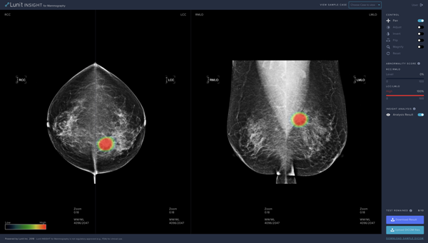 루닛 인사이트 실시간 분석 결과는 웹사이트에서 디지털 유방촬영술 영상을 업로드하면 무료로 받아볼 수 있다.