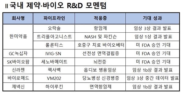 실제로 내년 국내 제약·바이오업계의 R&D 모멘텀은 다수 존재한다. 특히 내년 중순과 하순에는 주요 신약 파이프라인의 임상 데이터 결과 발표와 신약 승인 등이 몰려있다. 업계는 그 결과에 따라 본격적인 R&D 모멘텀이 살아날 것으로 기대하고 있다.