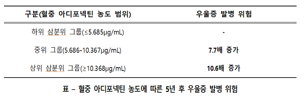 그리고 5년 뒤 우울증의 발병 위험성을 분석한 결과 혈중 아디포넥틴 농도가 상위 삼분위에 해당하는 노인들은 하위 삼분위의 노인들에 비해 우울증 발병 위험이 11배 가까이 증가하는 것으로 나타났다.