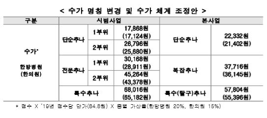 급여 대상은 근골격계 질환으로 한의원과 한방병원에서 단순추나, 복잡추나, 특수(탈구)추나를 받은 경우로 환자 본인부담금은 1~3만원 수준이다.