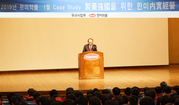 한미약품그룹 임성기 회장은 2일 영업사원 교육장에서 '제약강국을 위한 한미 내실경영'을 새해 경영 슬로건으로 선포했다.
