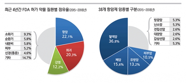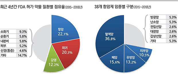 4년간 허가된 38개의 항암제 중 약 37%인 14개가 혈액암이고, 대부분 급성골수성백혈병, 림프종 치료제다.