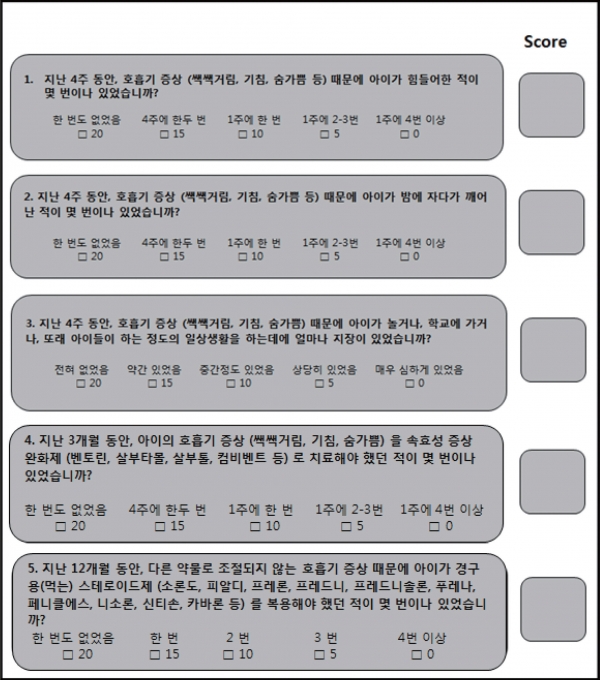 설문지는 모두 5개의 문항으로 이뤄져 있다. 1~3번은 4주간의 호흡기 증상을 살펴보는 질문으로 구성돼 있고, 4번과 5번은 각각 3개월의 호흡기 증상에 따른 증상 완화제 사용 횟수와 12개월 동안 사용한 경구용 스테로이드제 사용 횟수를 평가한다.