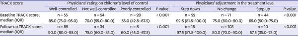 게다가 의사가 치료 수준을 상향조정한 군에서 TRACK 설문지 점수가 가장 낮은 반면, 하향조정한 군에서 가장 높았다. 추가 치료가 필요했다는 것은 조절이 안되고 있다는 점에서 TRACK 점수가 낮게 나와야 정상이다.