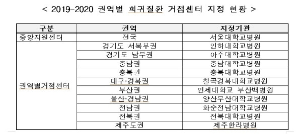 희귀질환 거점센터는 중앙지원센터인 서울대병원을 비롯한 권역별 10개 의료기관이 지정됐다.