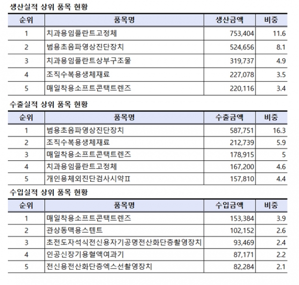 품목별로 살펴보면, 치과용임플란트(1조 731억원) 생산이 가장 많았으며, 이어 범용초음파영상진단장치(5247억원), 성형용 필러(2271억원) 순으로 나타났다.