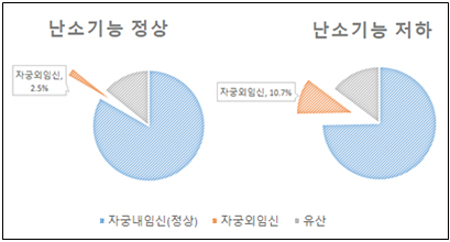 총 430개의 표본 중, 355명은 난소기능이 정상이었고 75명은 난소기능이 저하됐다. 난소기능이 정상인 355명중 자궁내임신, 자궁외임신, 유산이 각각 296명(83.4%), 9명(2.5%), 50명(14.1%)였고, 난소기능이 저하된 75명은 각각 56명(74.7%), 8명(10.7%), 11명(14.7%)이었다.