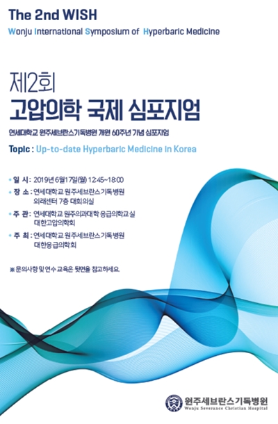 이번 행사에는 백순구 원주세브란스기독병원장과 허탁 대한고압의학회 회장, 국내외 고압산소치료 전문가들이 참석해 선구적인 연구와 치료 결과를 공유할 예정이다.