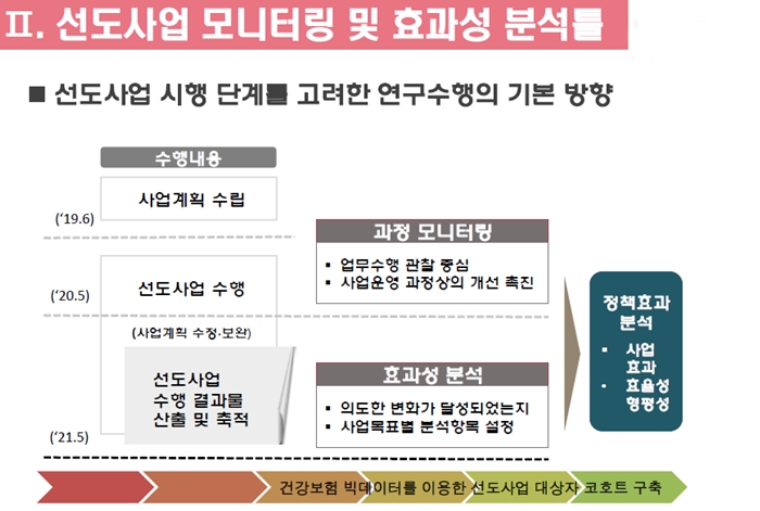 소개에 따르면 복지부가 발주하고 건보공단이 연구기관을 선정하는 이번 연구는 2019년부터 2022년까지 4년 동안 총 15억원이 투입돼 모니터링 및 효과성이 분석되는 방식이다.