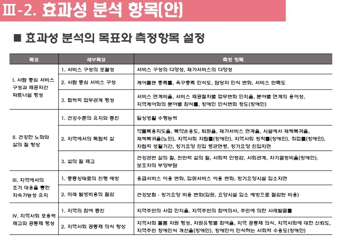 이어 효과성 분석은 선도사업 운영을 통해 달성하고자 하는 정책적 효과의 4가지 목표(△사람 중심 서비스 구성과 제공자간 파트너십 형성 △건강한 노화와 삶의 질 향상 △지역에서의 조기 대응을 통한 지속 가능성 유지 △지역포용력 제고와 공동체 형성)가 설정됐다.