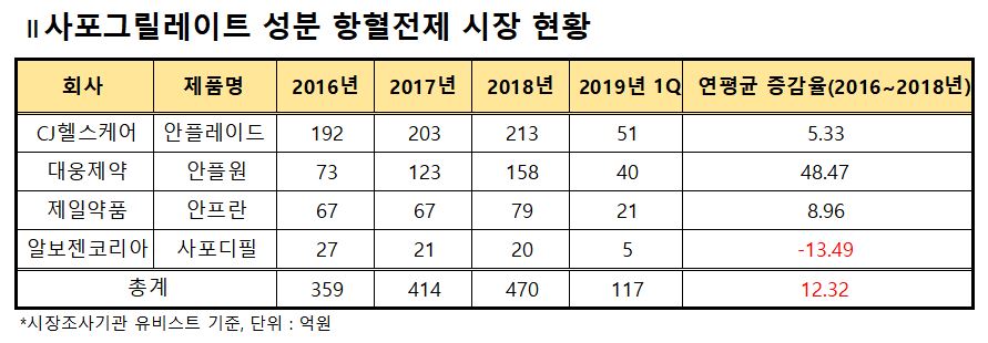 실제 사포그릴레이트 성분 항혈전제 시장은 지난해 기준 약 800억원 규모를 형성했다.