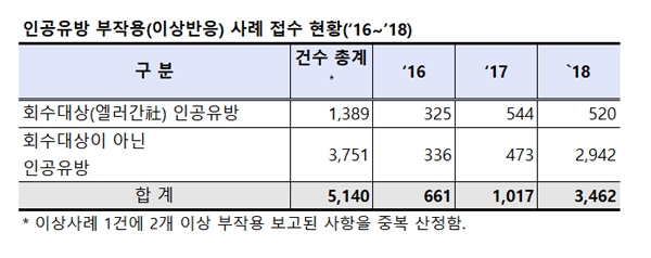 19일 보건복지위 남인순 의원(더불어민주당)은 식품의약품안전처가 제출한 '인공유방 부작용 사례 접수 현황'을 살펴본 결과, 2016년부터 지난해까지 최근 3년간 보고된 인공유방 부작용(이상반응) 사례가 2016년 661건에서 2017년 1017건, 2018년 3462건으로 크게 늘어난 것으로 나타났다고 밝혔다.