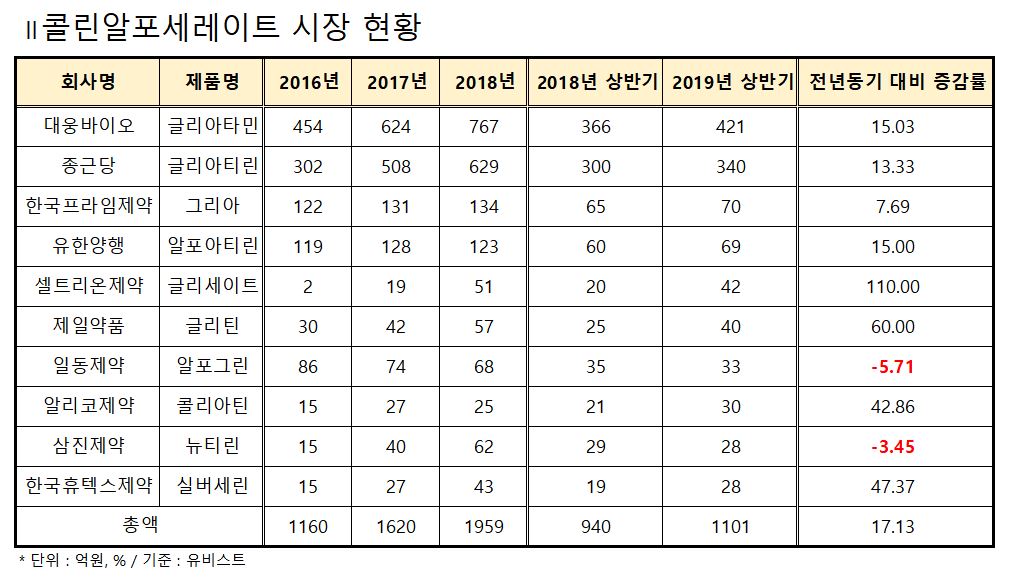 콜린알포세레이트 시장이 큰 폭의 성장을 기록하고 있지만, 대웅바이오의 글리아타민과 종근당의 글리아티린이 전체 시장의 2/3을 차지하고 있기 때문이다.