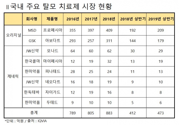 한미약품 피나테드(성분명 피나스테리드), JW신약 네오타드(성분명 피나스테리드), 한독테바 자이가드(성분명 두타스테리드), 한미약품 두테드(성분명 두타스테리드) 등은 매년 10~20억원 수준이다.