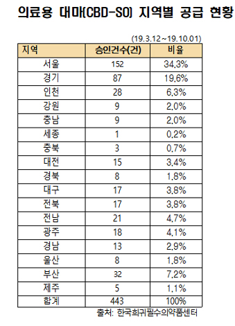 국회 보건복지위원회 남인순 의원(더불어민주당)이 한국희귀‧필수의약품센터로부터 제출받은 '의료용 대마 공급현황'에 따르면 대마를 의료목적으로 사용할 수 있도록 허용한 3월 12일부터 10월 1일까지 약 6개월간 총 443건(남성 253건, 여성 190건)이 공급됐다.
