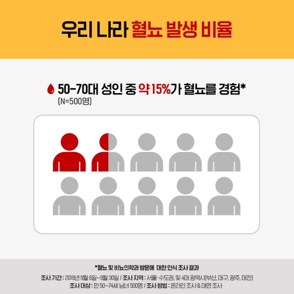 대한비뇨의학회(회장 이규성)가 지난 9월 서울, 경기, 인천, 부산, 대구, 광주, 대전에 거주하는 50세 이상 74세 이하 성인 남녀 500명을 대상으로 설문을 진행한 결과, 14.8%인 74명이 혈뇨를 경험한 적이 있다고 응답했다.
