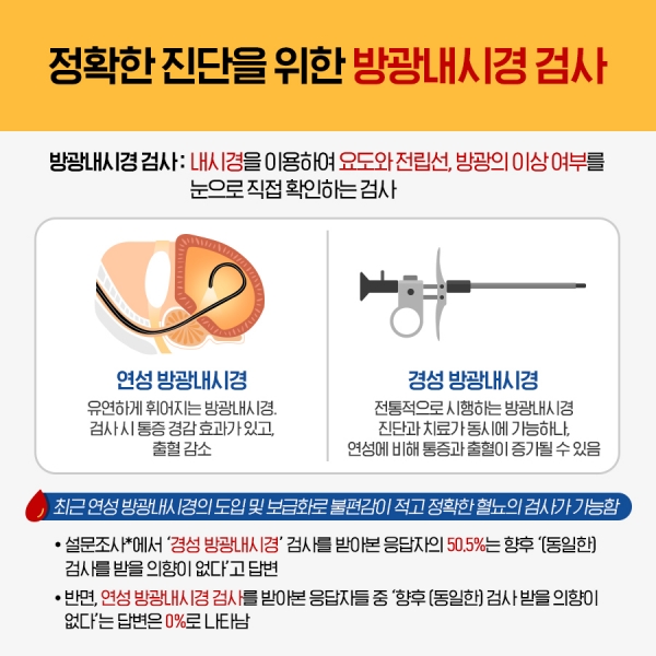 혈뇨 발생 시 정확한 진단을 위해 방광내시경 검사를 받아야 한다. 전통적으로 시행된 검사법인 금속 재질로 돼 있는 '경성 방광내시경'은 검사 과정에서 통증이 종종 수반돼 검사 과정에 어려움이 있었다.
