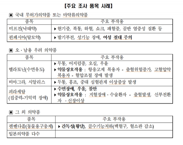 조사 결과에 따르면, 국내에서는 판매가 허가되지 않은 미프진(낙태)과 같은 품목 외에도 멜라토닌(수면유도), 피라세탐(집중력-기억력 장애), 펜벤다졸(동물용 구충제), 삭센다(비만치료) 등 오남용의 우려가 있는 의약품이 온라인에서 거래되고 있었다.