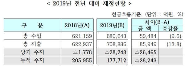 결과적으로 2019년은 전년에 비해서 수입과 지출이 모두 증가했으나, 수입증가(9.6%)보다 지출증가(13.8%) 규모가 더 커 당기수지는 전년보다 2조 6465억원 감소한 것이다.