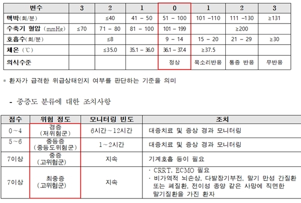대부분의 선별진료소와 의료기관에서 사용하는 분류 기준이 이에 해당되는데, 각 항목에 대해 0~3점을 매기고 합산한 점수가 4점 이하면 경증, 5~6점은 증등증, 7점 이상은 중증·최중증이다.