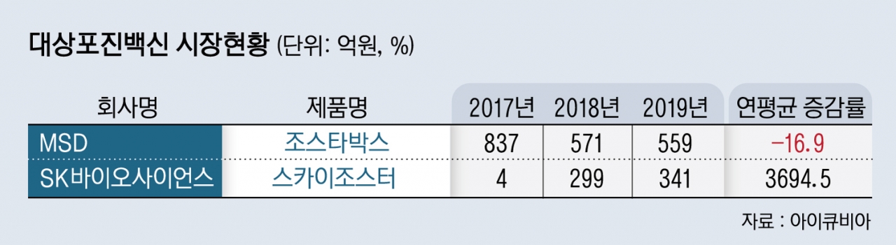 SK바이오사이언스 관계자는 "국내 임상을 통해 시장 경쟁력을 입증했고 가격 측면에서도 경쟁 우위에 있어 시장에서 빠르게 안착할 수 있었다"며 "가격이 저렴한만큼 대상포진백신 접종을 원하는 환자들도 스카이조스터를 원하는 추세"라고 강조했다.
