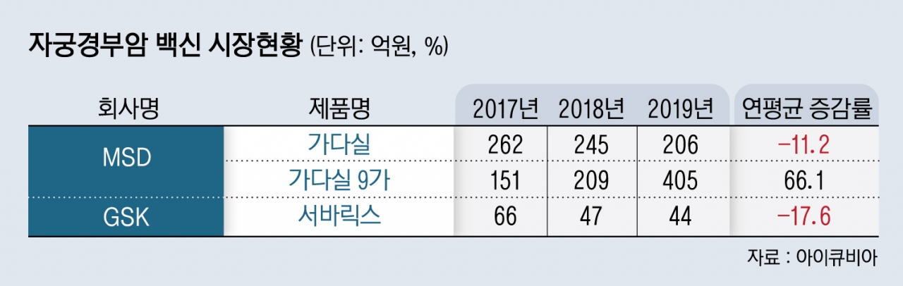 자궁경부암백신 시장도 재편되고 있다. MSD의 가다실9가 발매 3년여 만에 시장 주도권을 잡았다. 현재 판매 중인 자궁경부암 백신 중 예방효과가 가장 높다는 데이터를 앞세워 차별화에 성공한 셈이다.