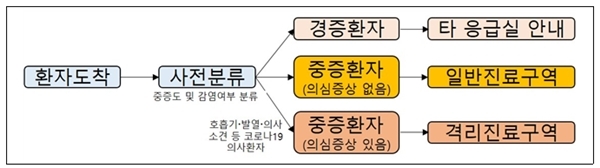 사전환자분류소에서 중증도·감염여부를 분류하고, 코로나19 확진 및 의심(발열, 호흡기 증상 등) 중증응급환자는 격리진료구역에서 응급처치를 제공하는 시스템인 것이다.
