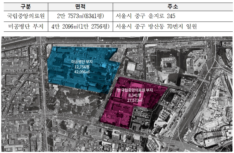 이날 서울시는 기자회견을 통해 국립중앙의료원 신축이전과 중앙감염병병원 건립 사업의 대안 부지로 서울 중구 방산동 70번지 일대 미공병단 부지를 제안했다.