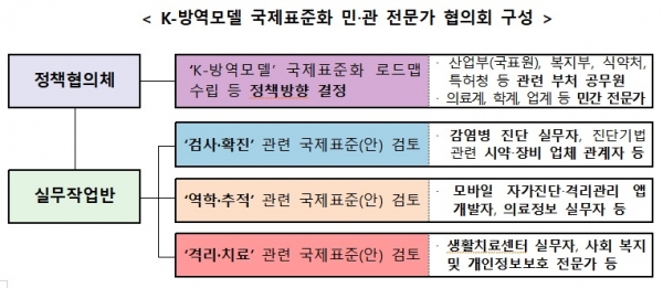 민간 전문가로는 코로나19 등 감염병 의료 전문가, 자동차이동형·도보이동형 등 선별진료소 제안·운영자 및 의료분야 국제표준 전문가 및 진단키트·선별진료소 관련 업체, 모바일 앱 개발 등 정보통신 전문가, 표준특허 전문가 등도 참여한다.