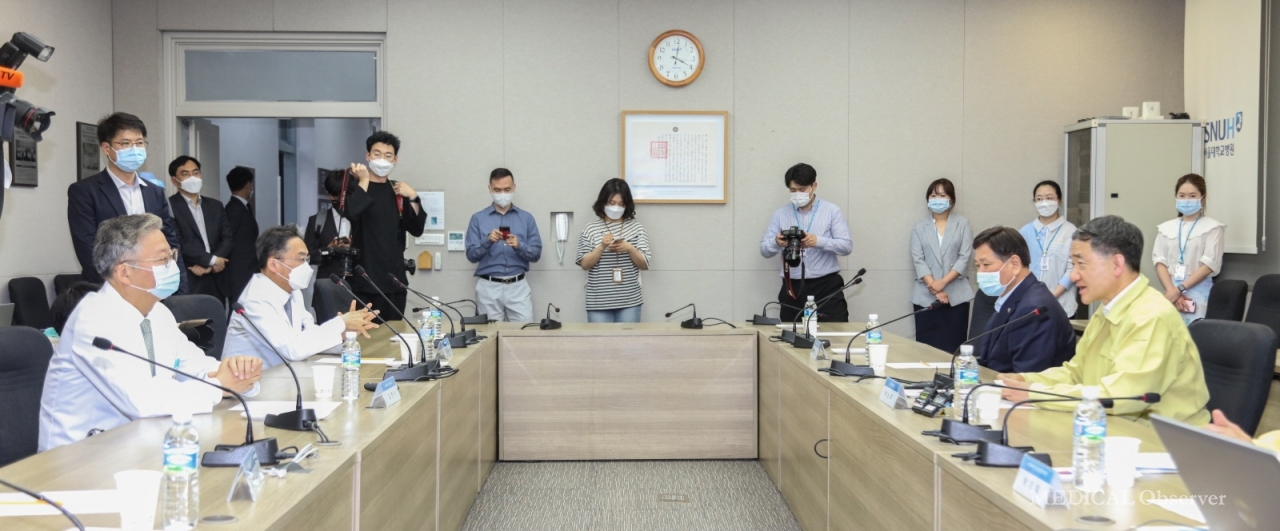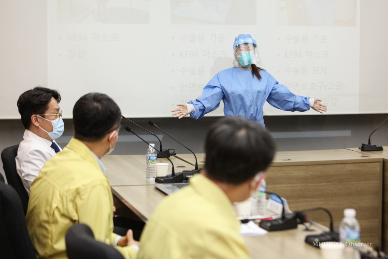 11일 오후 서울대병원에서보건복지부 박능후 장관이 현장 의료진에게 하계 보호구 사용에 대한 후기를 듣고 있다.