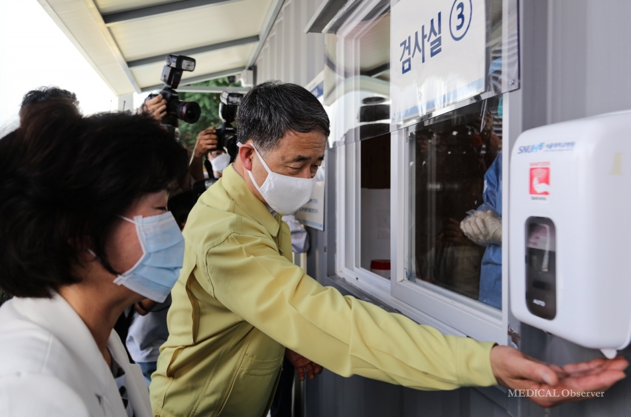 11일 오후 서울대병원 선별진료소를 방문한 박능후 장관이 손소독제를 사용하고 있다.