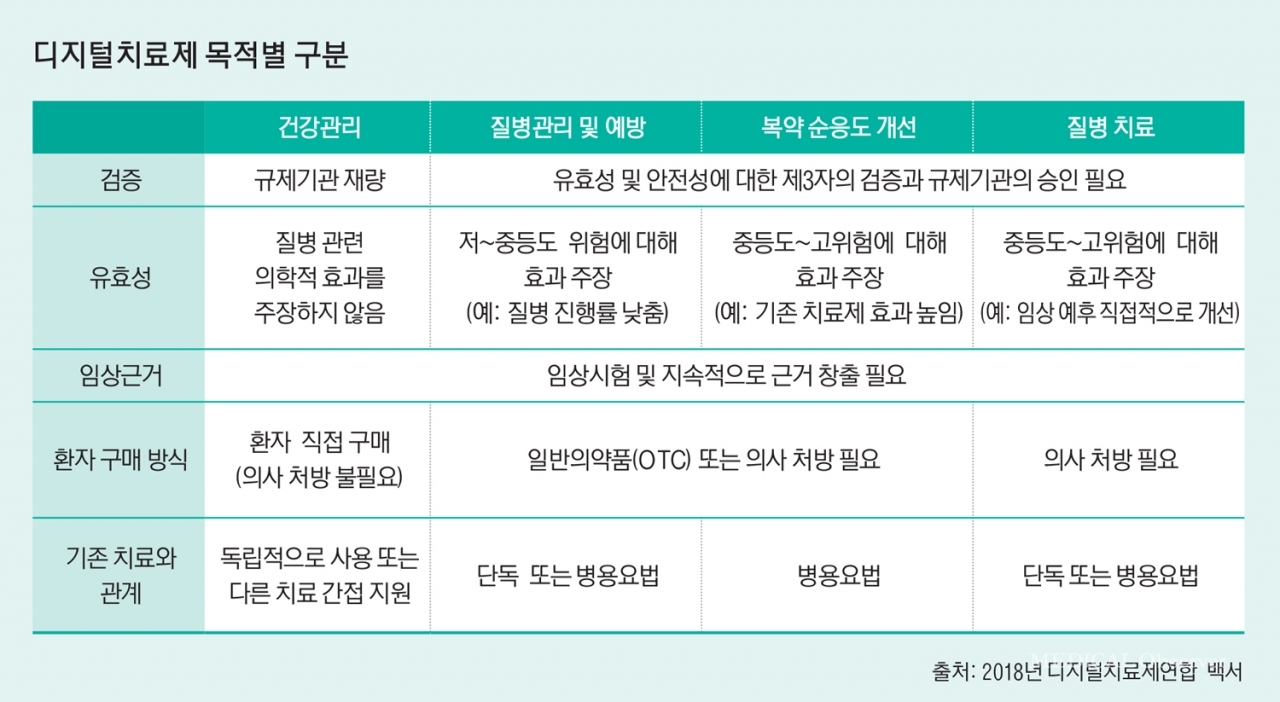 전통적인 약물에 비유하면 △질병관리 및 예방 △복약 순응도 개선 등 목적의 디지털치료제는 약국이나 편의점에서 처방전 없이 구매 가능한 일반의약품이나 의사 처방이 필요한 전문의약품에 속한다. 질병 치료 목적은 의사 처방이 필요한 전문의약품이라고 볼 수 있다.