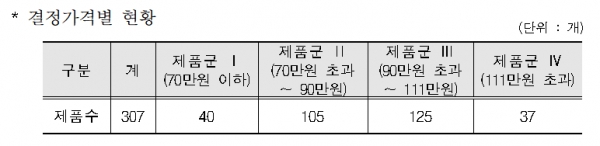 가격 고시 대상 제품은 307개로 ▲70만원 이하(40개) ▲70만원 초과~90만원 이하(105개) ▲90만원 초과~111만원 이하(125개) ▲111만원 초과(37개)로 나눠진다.