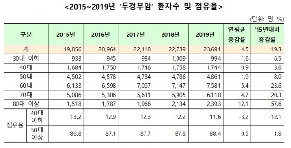 전체 환자에서 50대 이상이 차지하는 비율은 2015년 86.8%, 2016년 87.1%, 2017년 87.7%, 2018년 87.8%로 꾸준히 80%를 웃돌았다.