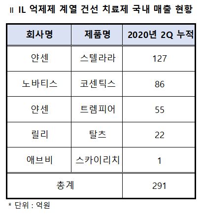 시장에 먼저 출시한 약물들의 처방이 많을 수밖에 없었는데, 올해 상반기까지 누적 실적을 보면 스텔라라가 127억원(IQVIA 기준)으로 가장 많았고, 코센틱스(86억원), 트렘피어(55억원), 탈츠(22억원) 등으로 뒤를 이었다. 가장 늦게 출시된 스카이리치는 2분기에만 1억원의 매출을 기록했다.