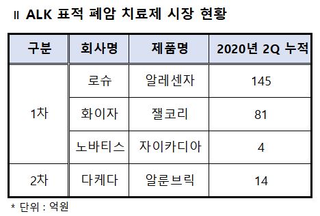 현재 ALK 양성 비소세포폐암 치료제 시장은 화이자의 잴코리(크리조티닙)와 노바티스 자이카디아(세레티닙), 로슈 알레센자(알렉티닙)이 1차 치료제 자리에서 경쟁하고 있다.