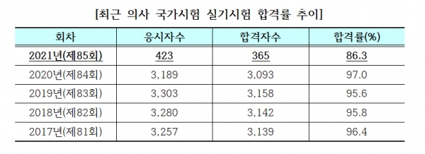 국시 실기시험의 합격률 또한 제84회(97%), 제83회(95.6%), 제82회(95.8%), 제81회(96.4%) 등 최근 5년간 통상 95%를 넘었지만 올해는 86.3%로 약 10% 급락했다.