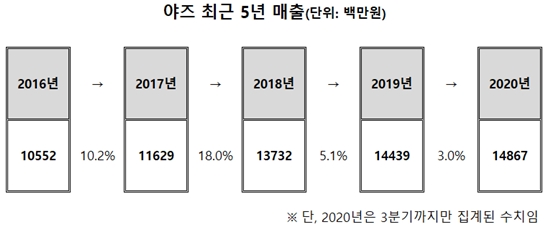 실제로 지난 2016년부터 2019년까지의 야즈 매출액은 의약품 시장조사기관 아이큐비아 기준으로 105억 5200만원, 116억 2900만원, 137억 3200만원, 144억 3900만원이다.