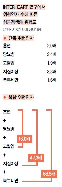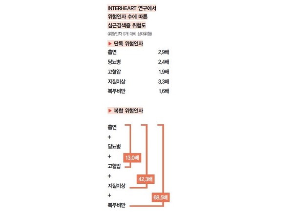 하지만 이들 3개 인자가 동시에 발현되는 경우 위험도는 13.0배까지 급증했다. 흡연, 당뇨병, 고혈압에 지질이상까지 합쳐지면 위험도는 42.3배, 여기에 복부비만까지 더해지면 위험도가 68.5배로 높아진다. 위험인자 수에 따른 심혈관질환 위험이 1 + 1 = 2라는 단순한 산술적 합산과는 다르게 기하급수적으로 증가한다는 것을 엿볼 수 있다.