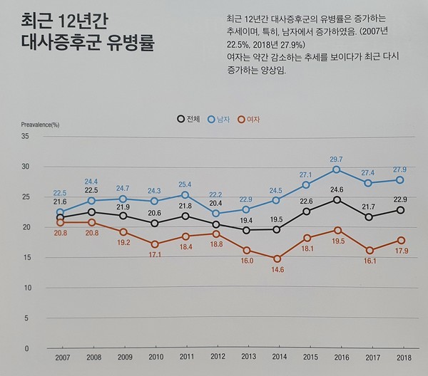 국민건강영양조사 제4기부터 제7기까지인 2007~2018년 자료에서 19세 이상 성인 데이터를 분석한 결과, 최근 12년간 대사증후군 유병률은 오름세가 나타났다. 특히 남성에서 유병률 증가가 두드러졌다.