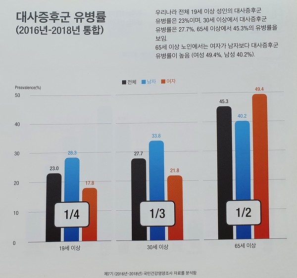 이어 국건영 제7기(2016~2018년) 데이터만 분석한 결과, 19세 이상 4명 중 1명(23%), 30세 이상 3명 중 1명(27.7%), 65세 이상 2명 중 1명(45.3%)이 대사증후군을 갖고 있었다.
