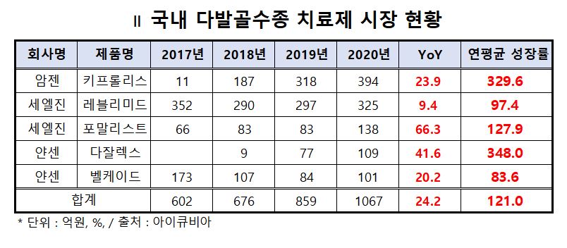 시장조사기관 아이큐비아에 따르면 국내 다발골수종 치료제 시장은 2017년 602억원에서 2020년 1067억원으로 연평균 121% 성장했다.