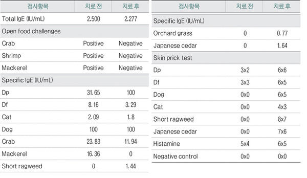 본 환자의 치료 전후 이화학적 검사 및 피부단자 검사 결과는 다음과 같았다.