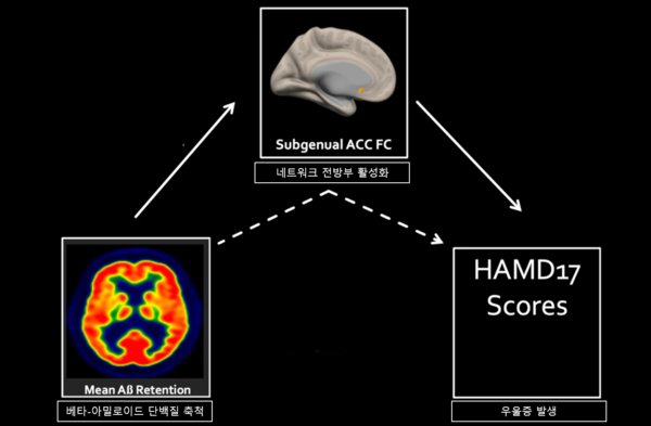 특히 연구팀은 알츠하이머병의 주요 위험요인으로 알려진 베타-아밀로이드 단백질 축적이 우울증 발생의 직접적 요인이 아니라, 디폴트모드네트워크의 전방 활성도를 증가 시켜 우울증을 일으킨다는 사실을 세계 처음으로 규명했다.