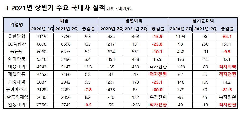 현재까지 공개된 2021년 2분기 경영실적을 분석한 결과, 상위 10개 국내 제약사의 매출은 전년 동기 대비 성장한 모습을 보였다.