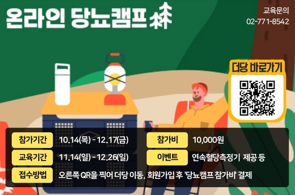 신청은 한국당뇨협회 홈페이지(dangnyo.or.kr)에 접속해 캠프 배너 또는 팝업창을 클릭해서 접수하면 된다. 캠프 기간은 12월 26일까지이며, 참가비는 1만원이다. 문의는 한국당뇨협회 사무국(전화 02-771-8542, 카카오톡 '한국당뇨협회')으로 하면 된다.