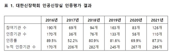 대한신장학회는 2016년부터 2020년까지 5차에 걸쳐 시행한 전국 인공신장실 인증평가 결과를 발표했다.